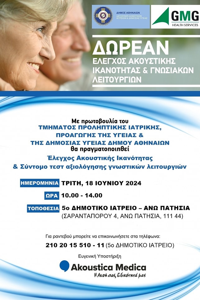 Το Τμήμα Προληπτικής Ιατρικής, Προαγωγής της Υγείας και Δημόσιας Υγείας του Δήμου Αθηναίων, σε συνεργασία με την Εταιρεία GMG Health Services και την Acoustica Medica, συνεχίζουν την επιτυχημένη σειρά δράσεων ενημέρωσης του κοινού για τις